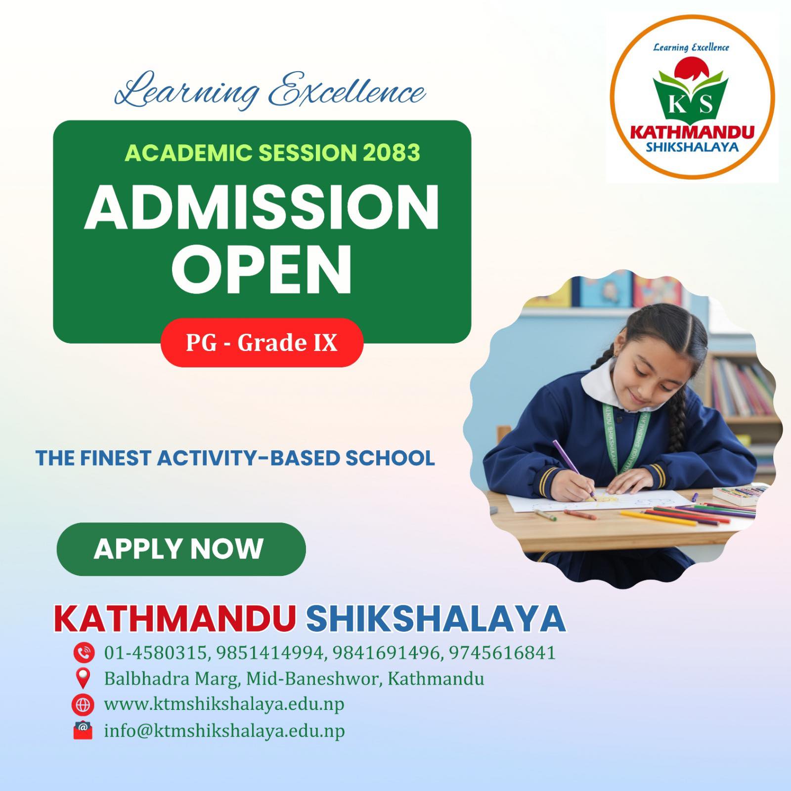 Kathmandu Shikshalaya, located in Bal Bhadra Chowk, Mid-Baneshwor, Kathmandu-31, announced that admissions are open for Play group to Grade 9 for the academic year 2082/83.