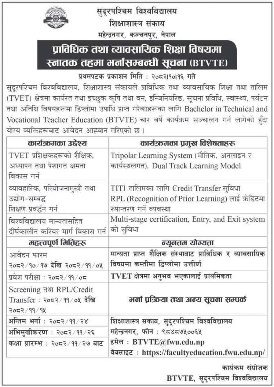 Far Western University has announced admissions for the Bachelor in Technical and Vocational Teacher Education (BTVTE) program. This four-year program is offered by the Faculty of Education for individuals who hold a diploma in fields such as Agriculture and Forestry, Engineering, Information Technology, Health, Tourism, and Hospitality.