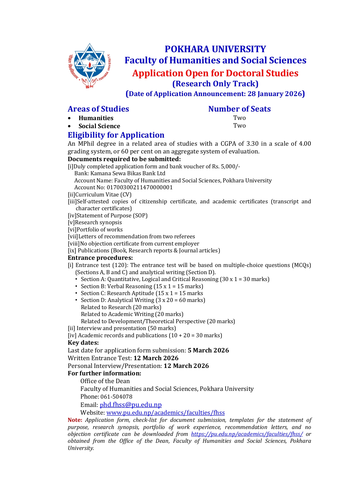 Note:Detailed application notice, application form, formats for a statement of purpose (SoP), research synopsis, portfolio of work experience, letter of recommendation, checklist for document submission, and no objection certificate can be downloaded from https://pu.edu.np/academic/faculties/fhss or obtained from the office of the dean, Faculty of Humanities and Social Sciences, Pokhara University.