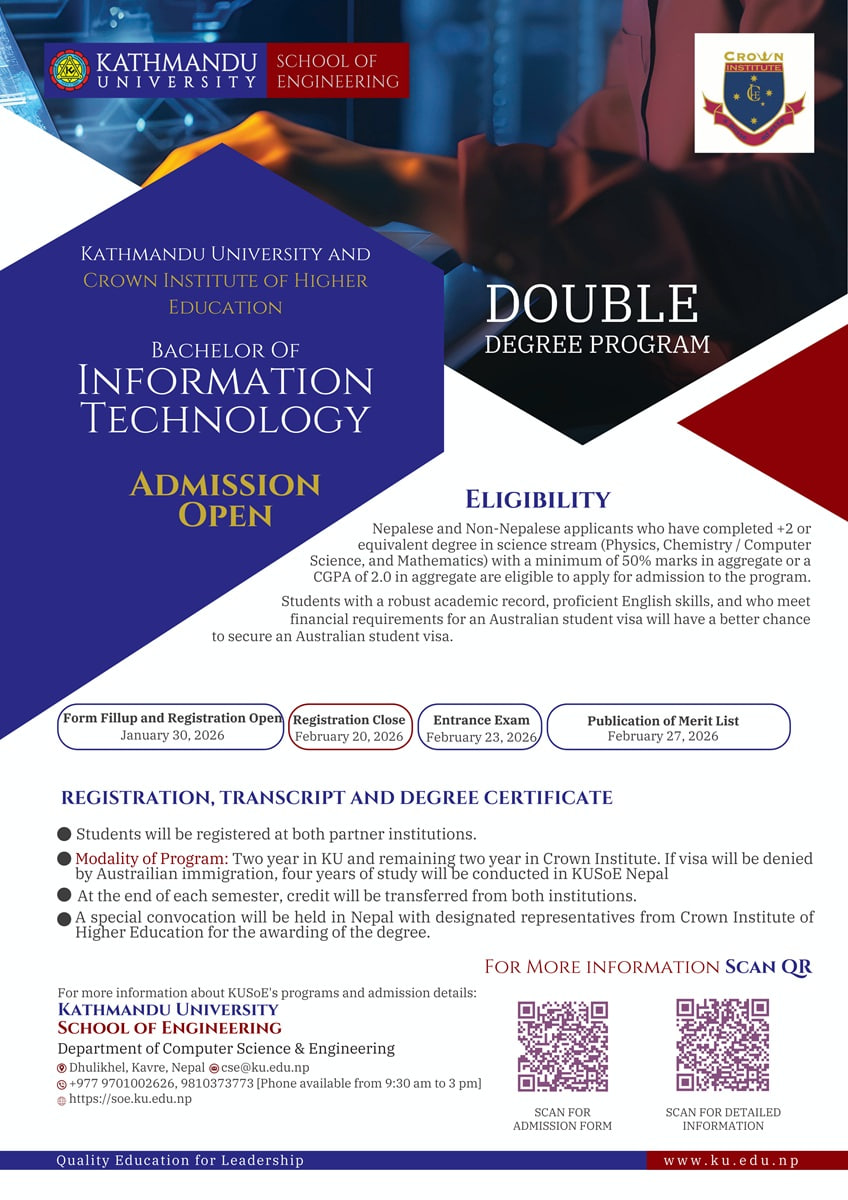 Kathmandu University (KU) has announced admissions open for the Bachelor of Information Technology (BIT), a dual program in collaboration with the Crown Institute of Higher Education (CIHE), Australia. KU administers this collaborative undergraduate program for the initial two years of study, and CIHE, Australia, manages the remaining two years. Each intake can accommodate 30 students, providing a unique opportunity for students to engage in both academic environments within the promising field of information technology.