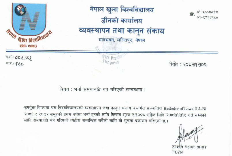 The Faculty of Management and Law at Nepal Open University has extended the admission deadline for the first year of the Bachelor of Laws (LL.B) program for the 2081 and 2082 groups.