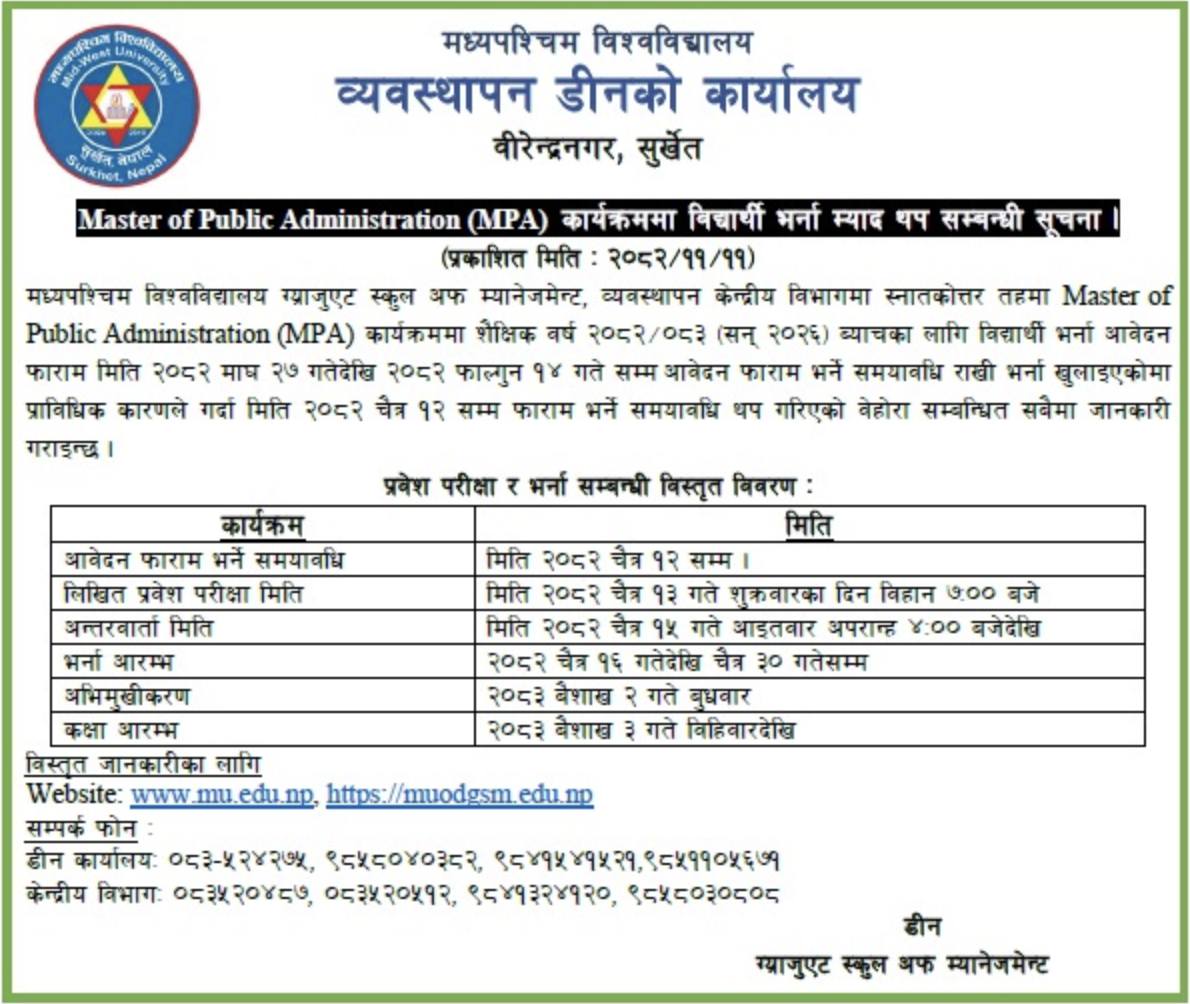Mid-West University, Office of the Dean, Graduate School of Management, has extended the application deadline for admission to the Master of Public Administration (MPA) for the academic year 2082/83 (2026).