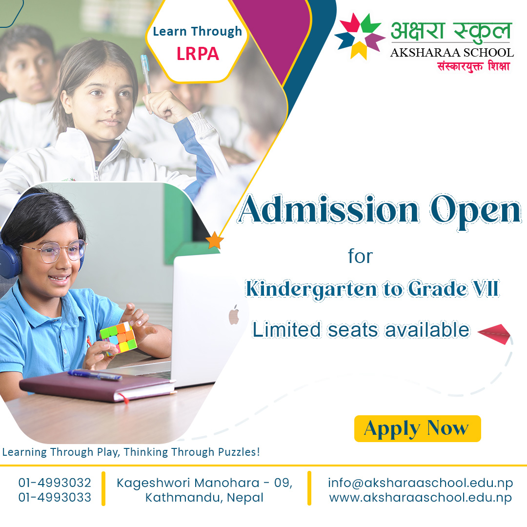 Located at Kandaghari-9, Kageshwari Manohara, Kathmandu, Aksharaa School is accepting admissions for students from Kindergarten through Grade VII.