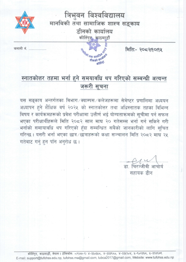 The Dean's Office, Faculty of Humanities and Social Sciences, Tribhuvan University, has extended the admission deadline for the Post Graduate Diploma (PGD) and Master's Degree (MA) programs.