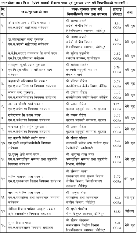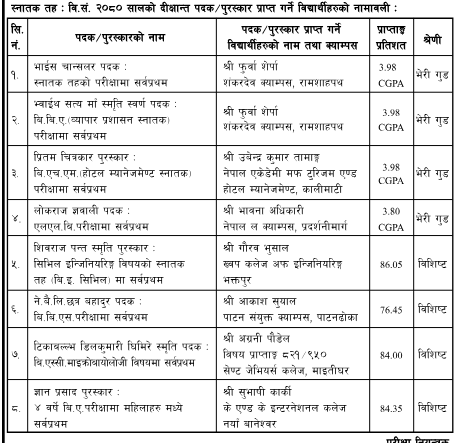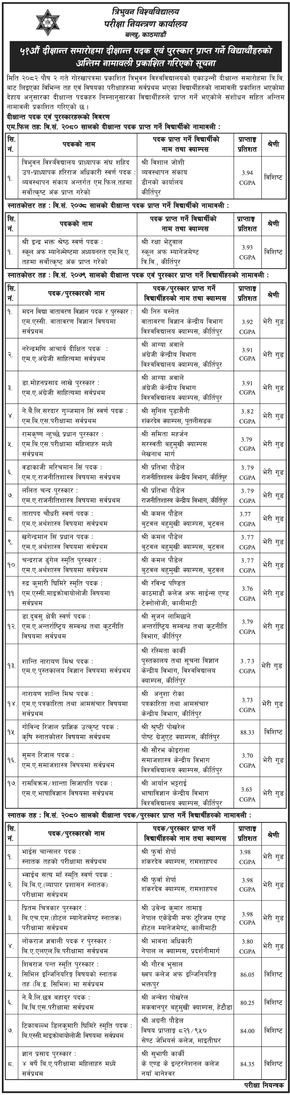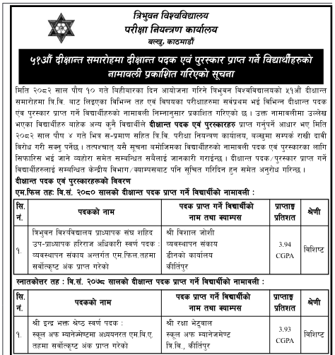 The Office of the Controller of Examinations at Tribhuvan University (TU), Balkhu, has released the final list of students selected to receive medals and awards at the upcoming 51st Convocation Ceremony scheduled for Poush 10 (Thursday).