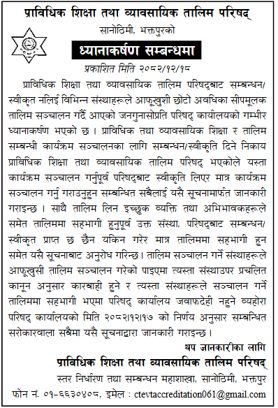 The Council's office has taken serious notice of public complaints regarding various institutions conducting short-term skill-based training programs on their own without obtaining affiliation or approval from the Council for Technical Education and Vocational Training (CTEVT). As CTEVT is the body responsible for granting affiliation/approval for conducting technical and vocational education and training programs, all concerned are informed through this notice to conduct such programs only after obtaining prior approval from the Council.