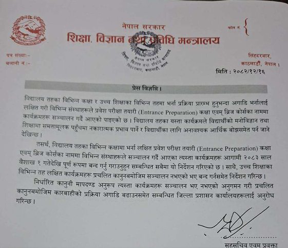 In response, a ministerial-level decision made on Chaitra 13, 2082 has mandated that all such programs be fully discontinued starting from Baisakh 1, 2083.
