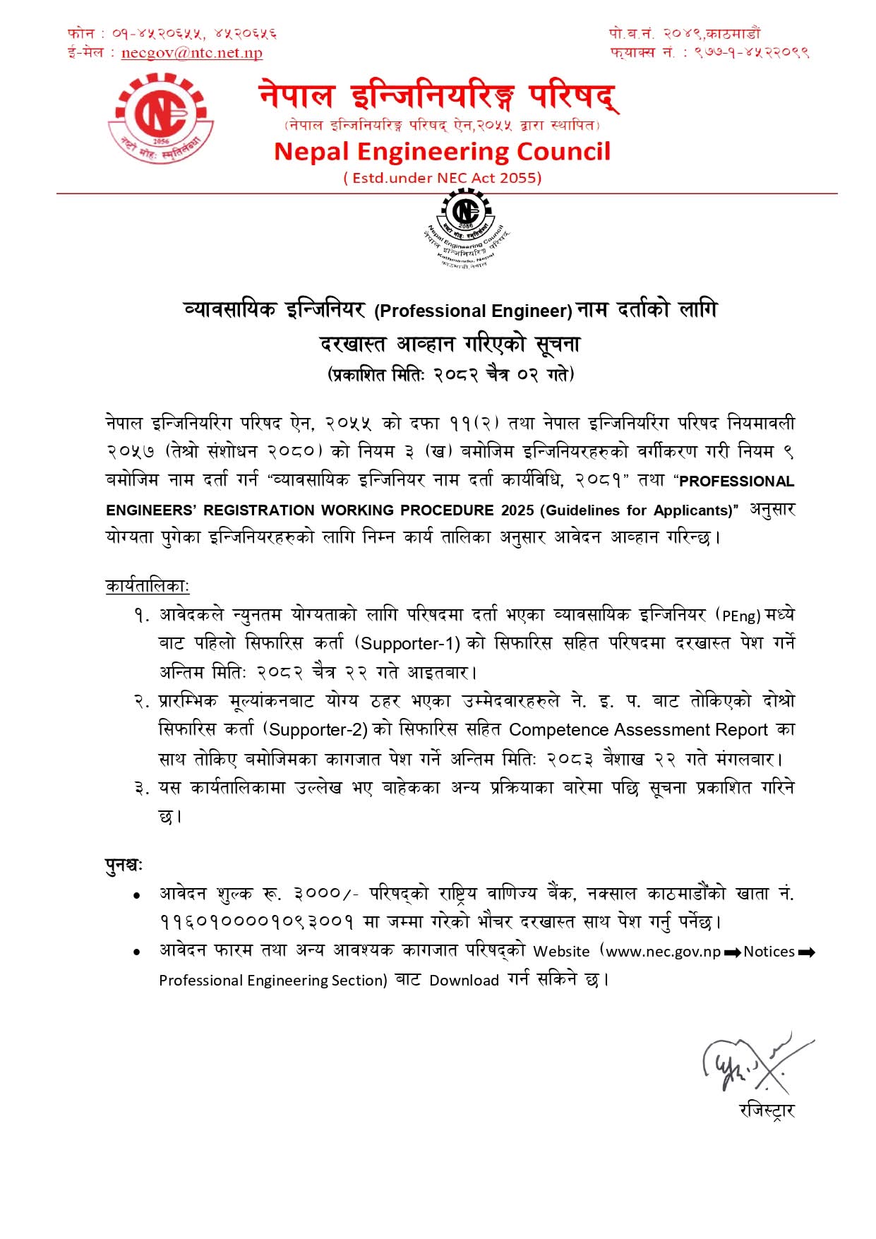 - Final Deadline: 2082 Chaitra 22 (Sunday) for submitting the application to the Council along with the recommendation from the first Supporter (Supporter-1) for the minimum eligibility to be registered as Professional Engineer (PEng).