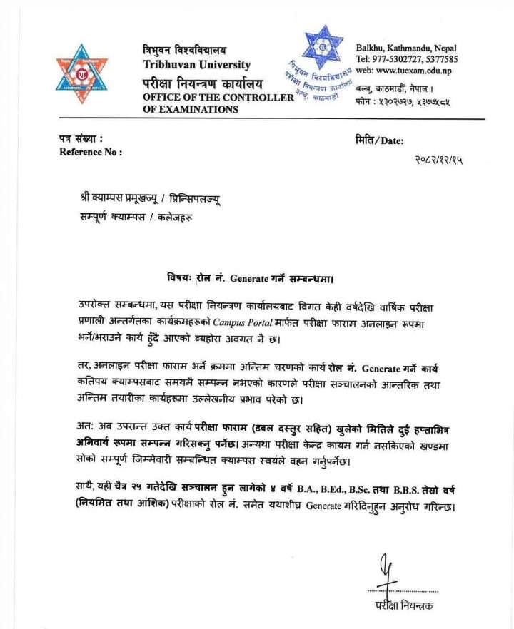 Tribhuvan University (TU), Office of the Controller of Examinations, has instructed campuses to mandatorily complete the generation of roll numbers within two weeks of the opening date of online examination forms.