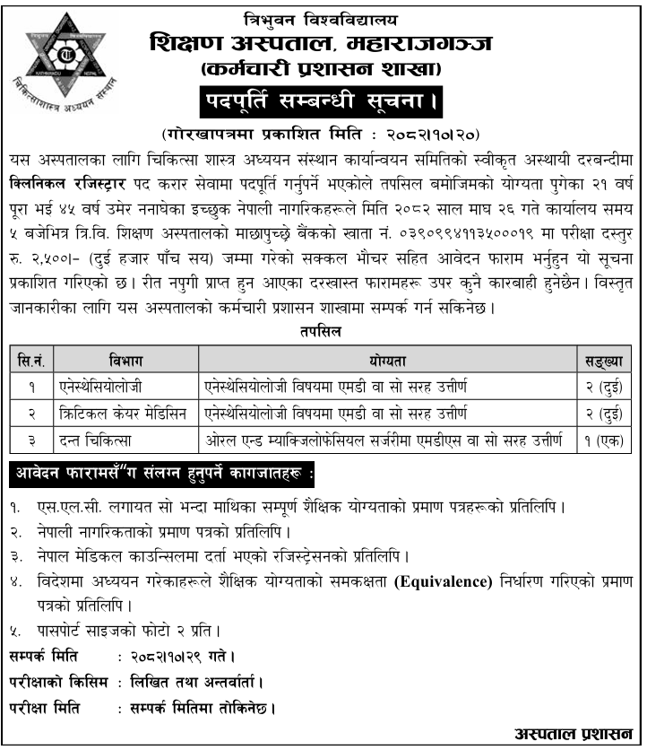 Tribhuvan University Teaching Hospital (TUTH) in Maharajgunj has announced vacancies for the temporary positions of Clinical Registrar on a contract basis, as approved by the Executive Committee of the Institute of Medicine. Interested applicants must submit their applications by Poush 23, 2082, within office hours (5:00 PM). An application fee of Rs. 2,500 must be deposited into the Machhapuchhre Bank account no. 0390994113500019.