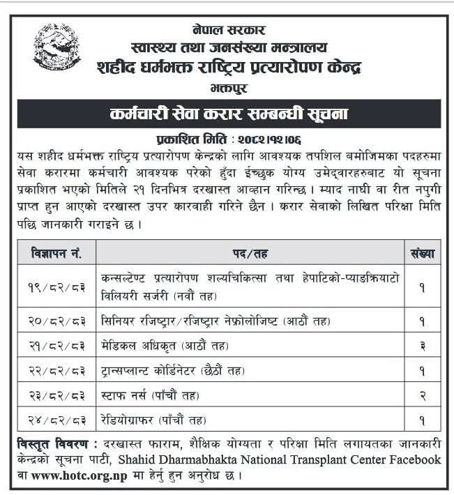 The Shahid Dharmabhakta National Transplant Center in Bhaktapur, under the Ministry of Health and Population, Nepal, is seeking qualified candidates for several contract-based positions. Interested individuals are encouraged to submit their applications within 21 days of the publication date of this notice. Late or incomplete applications will not be considered.